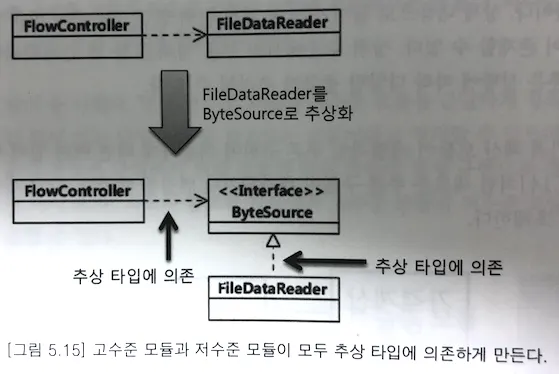 위의 예제에선 FlowController에서 FileDataReader을 의존하고 있었다. 추상화한 것을 만들고 싶으면 FileDataReader를 추상화한 ByteSource 인터페이스를 만들고 FlowController에서 FileDataReader를 의존하고 있던 것을 ByteSource로 변경하면 된다. 클래스 다이어그램 상에서 FileDataReader 클래스입장에선 의존 받던 것이, 자신의 ByteSource를 의존하고 있는 방향으로 화살표가 '역전' 되었다.