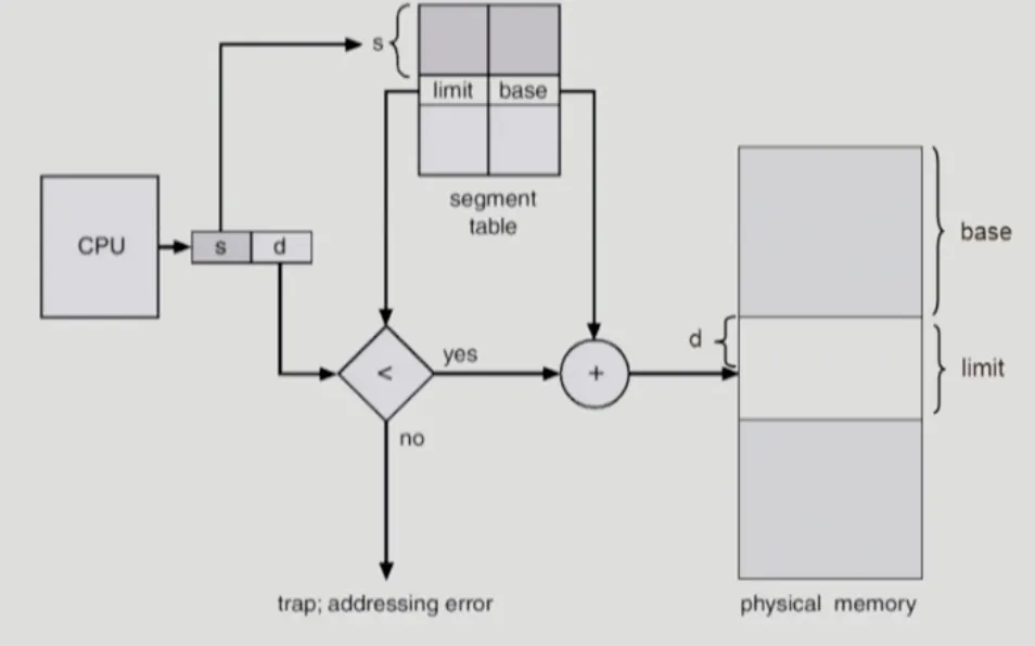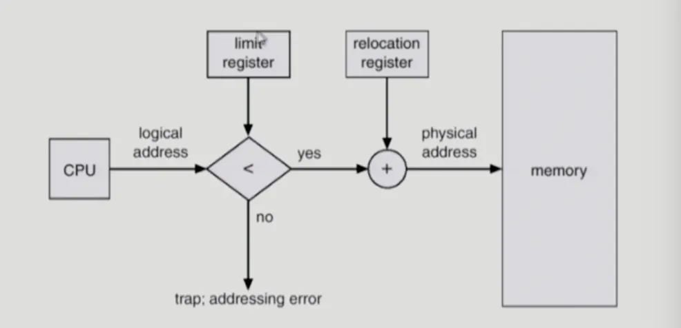 limit register는 프로그램의 크기를 담고 있는 값으로, 해당 프로세스에 할당된 값이 아닌 다른 프로세스의 값을 요청할 수 없게 하기 위해 존재한다. 실수로든 혹은 악의적으로든, 요청한 논리주소 값이 base + limit 을 합친 값보다 크다면 trap(adressing error)이 발생한다.