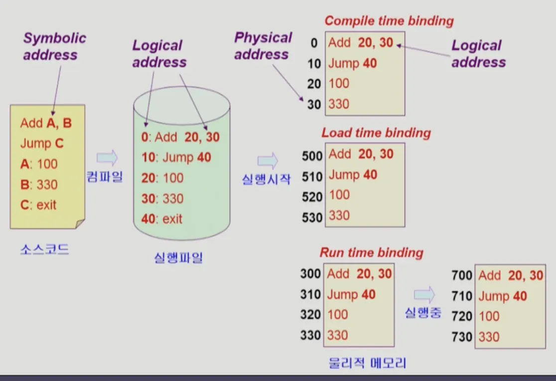 컴파일엔 논리주소만 결정되고, 실행시에 물리적인 메모리 주소가 결정된다. (논리 메모리에 특정 주소값을 더하는 방식으로 결정된다) 실행 중엔 변경되지 않는다.
