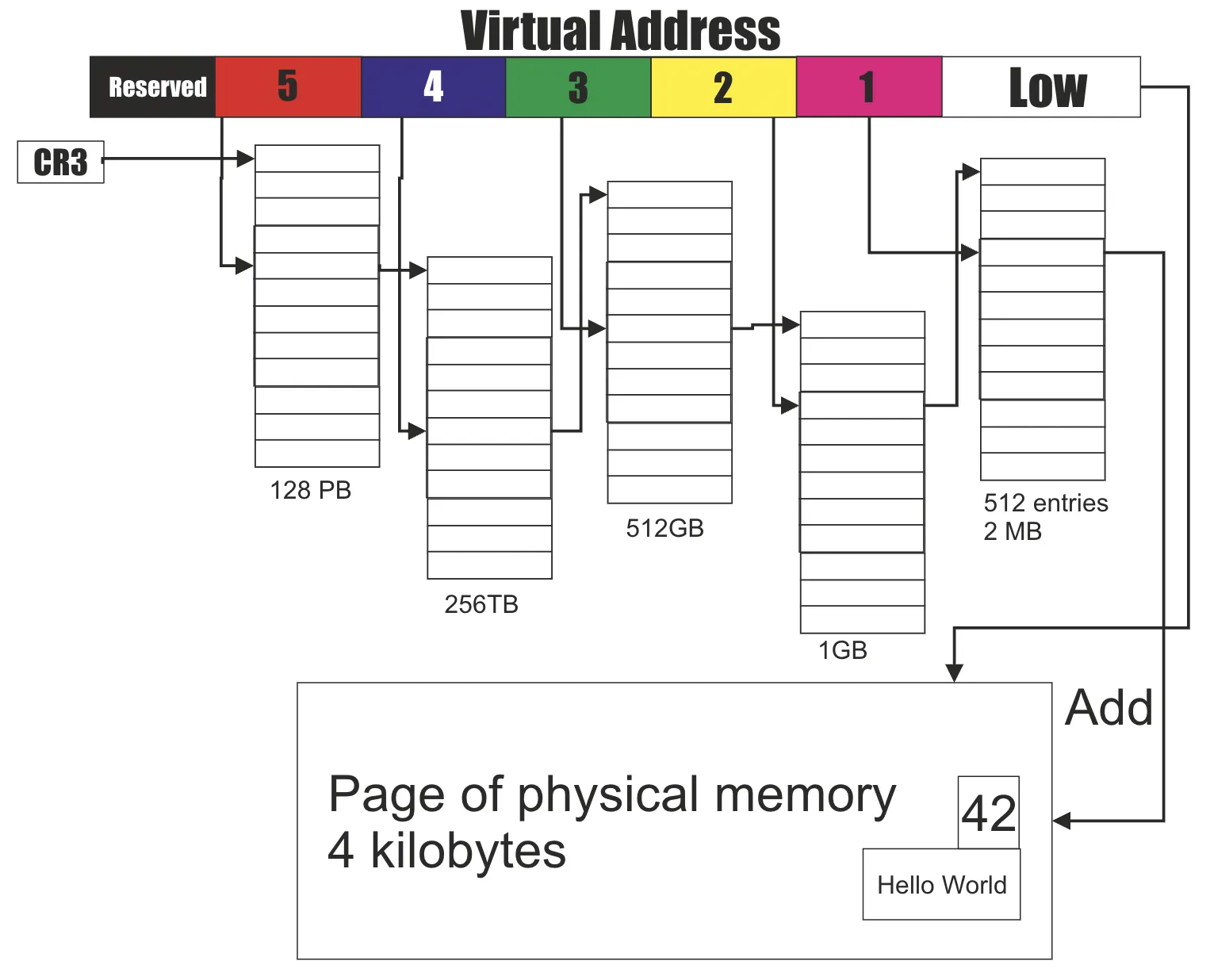 논리 메모리 주소를 몇비트까지 허용하느냐에 따라 가용한 논리 메모리 주소가 달라진다. 현대의 컴퓨터는 대개 64bit address를 쓰는데, 이는 16엑사 바이트이다. (참고-마이크로 소프트 문서) 페이지는 각 4KB이다. 16엑사 바이트를 4KB로 나누면, 4페타(10의 15승)개인데 페이지 테이블의 한 엔트리가 4B 정도를 차지하니.. 한 프로세스당 16페타바이트(!)의 페이지 테이블을 할당해야 한다.