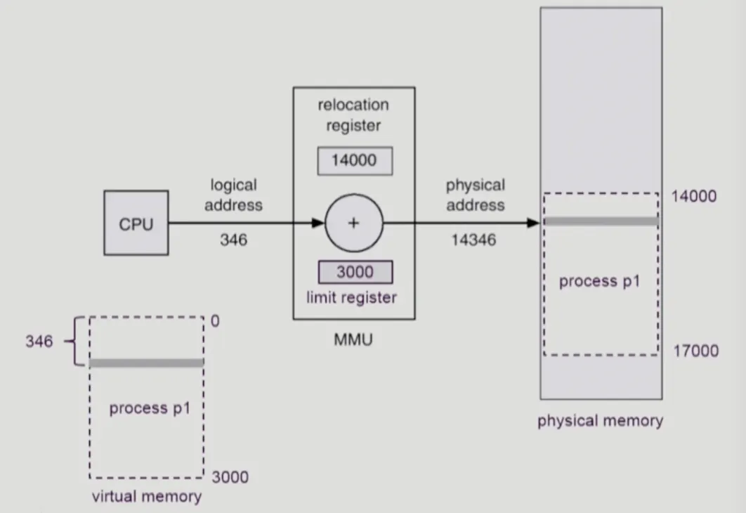 그때 그때 논리 주소를 가지고 물리 주소로 변환을 해줘야 하기 때문에, 하드웨어 지원이 필요함 (예. base and limit registers, MMU)