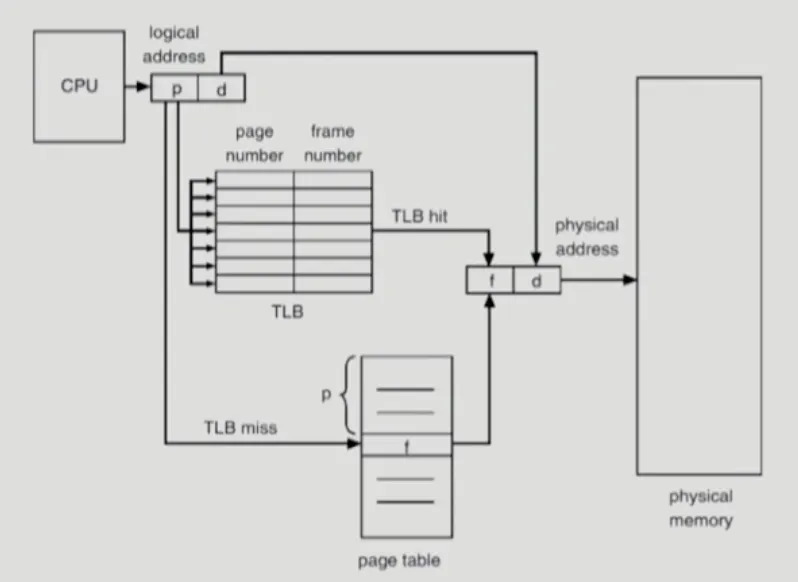 속도 향상을 위해 associative register 혹은 translation look-aside buffer(TLB) 라 불리는 고속의 lookup hardware cache가 활용된다.