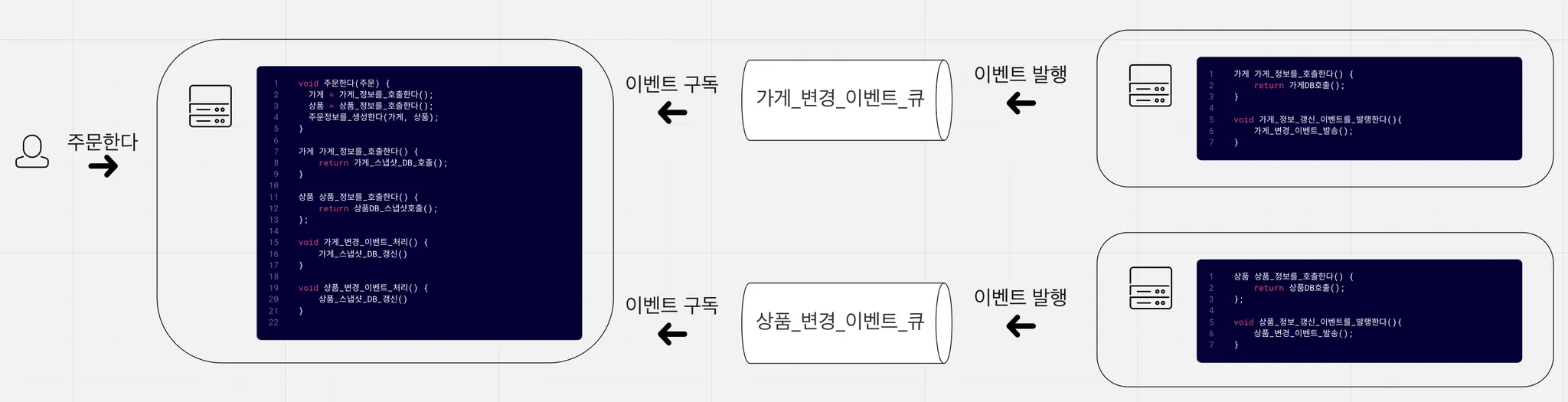 이 문제를 해결하기 위해선 각 서버가 서로간의 의존도를 낮추도록 해야 하는데, 이벤트를 활용한 메시징 처리도 이에 대한 대안입니다.