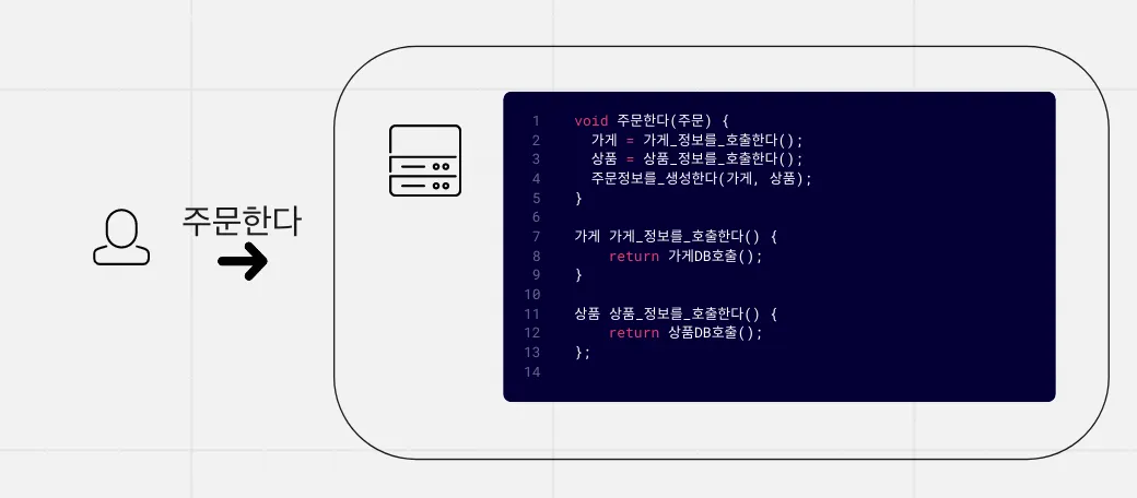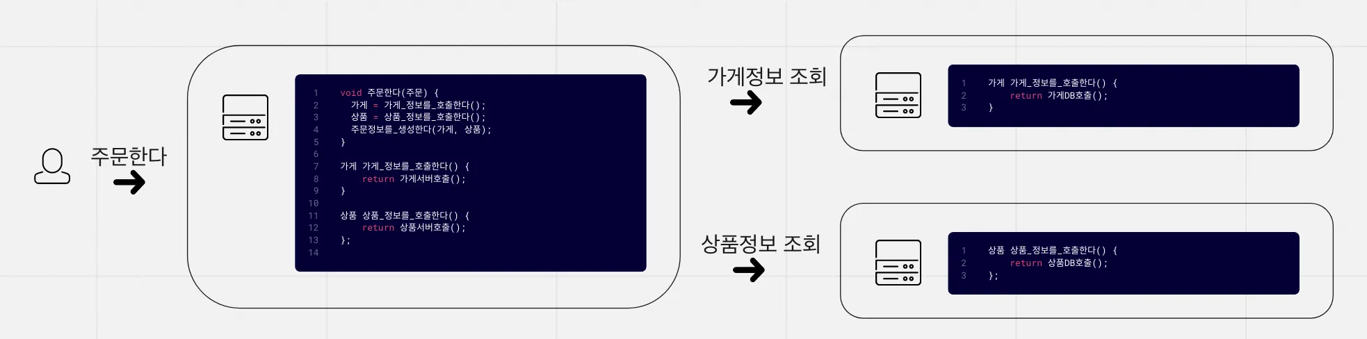 모놀리식 주문 로직. API 호출 한 번이면 모든 로직이 수행된다.