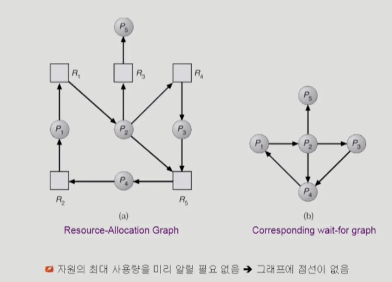 예방에서 본 자원 할당 그래프를 활용해도 탐지할 수 있지만, 예방과 달리 자원의 최대 사용량에 대해서 알 필요가 없으므로 간소화한 그래프를 활용할 수 있다.