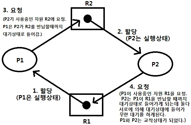 여러개의 프로세스가 서로의 자원을 요청하고 있는 상태를 의미한다.