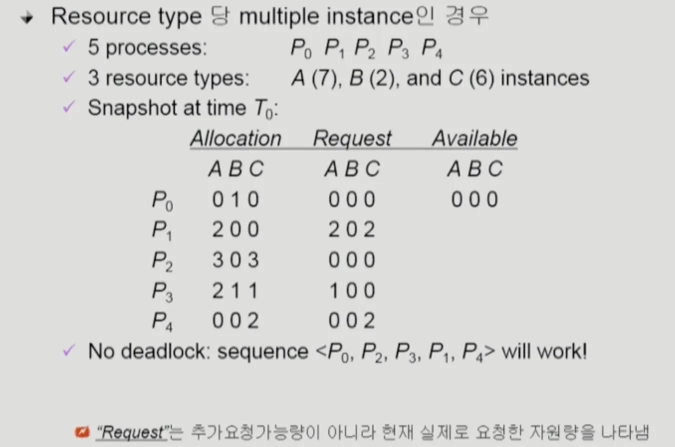 즉 위 표에서 P2는 자원을 요청하지 않았기에 가지고 있던 모든 자원을 반납할 것이라 예상하고, P1, P3이 요청한 A를 줄 수 있을거라 가정한다. 이와 달리 P2에서 무언가 요청을 하여서, 남은 자원으로 여러 요청에 필요한 만큼 할당해 줄 수 없는 상황이라면 데드락이라고 본다.