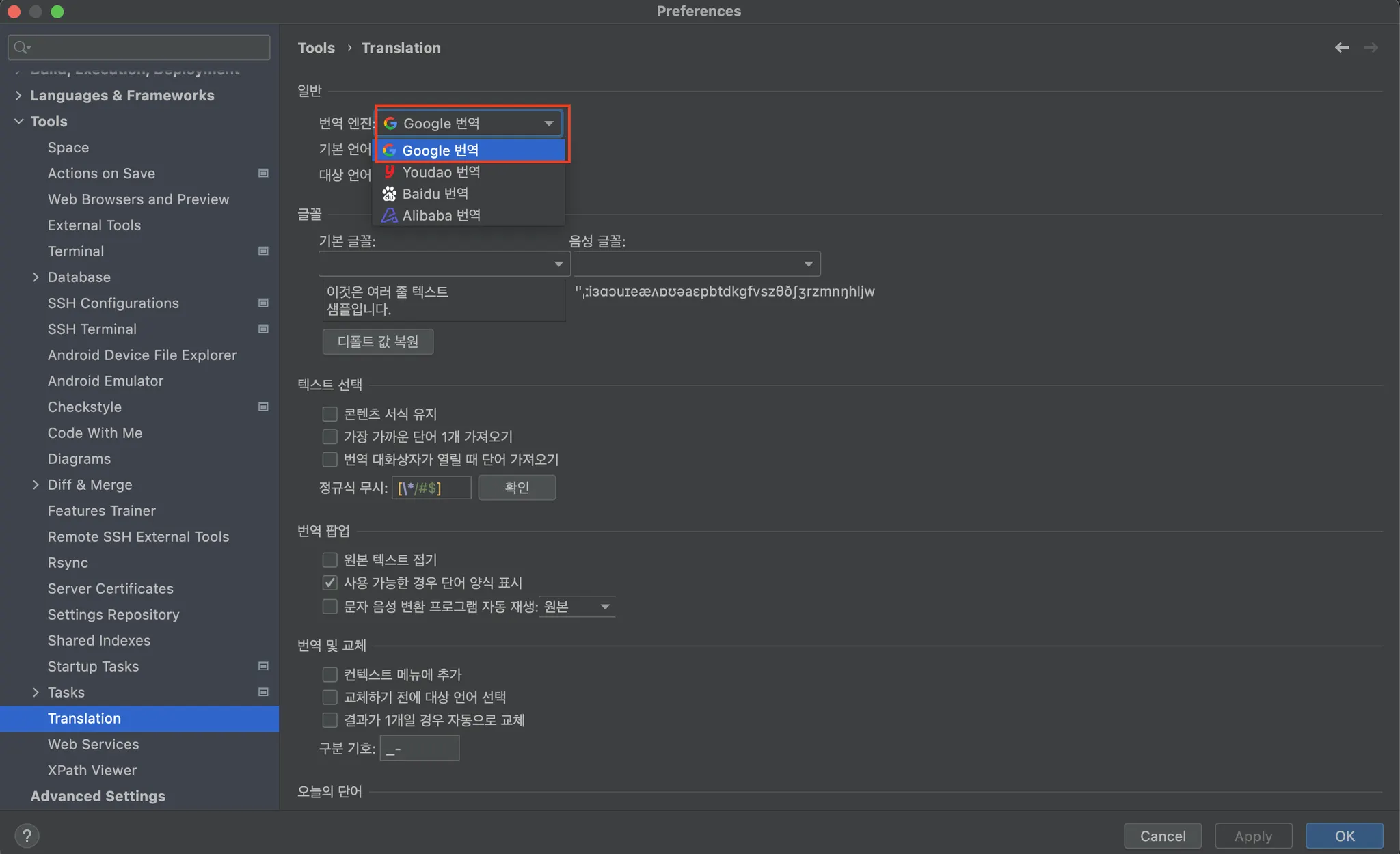 설정에 가보면 google 번역을 default로 하고, 기타 번역도 지원하는 것을 볼 수 있습니다. (중국어 번역을 위한 툴로 보이네요)