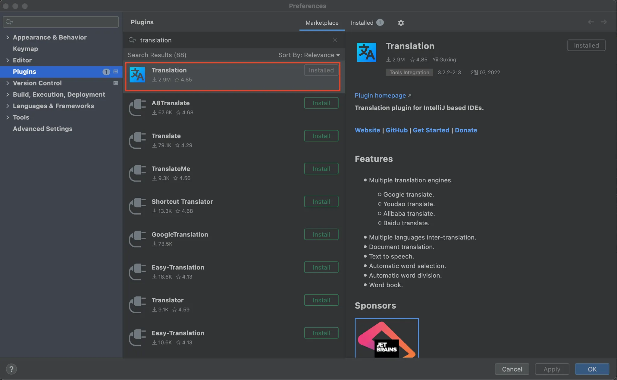 Preferences → Plugins → translation 검색을 통해 찾을 수 있습니다.