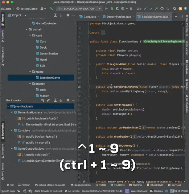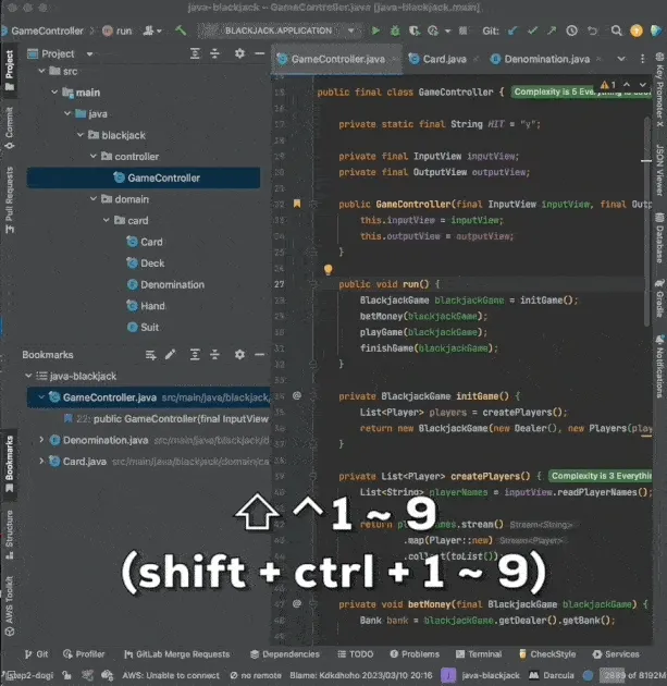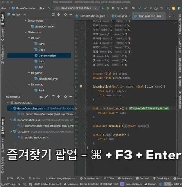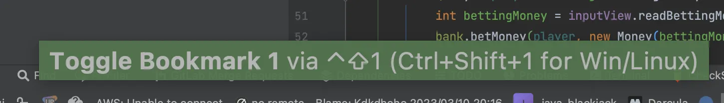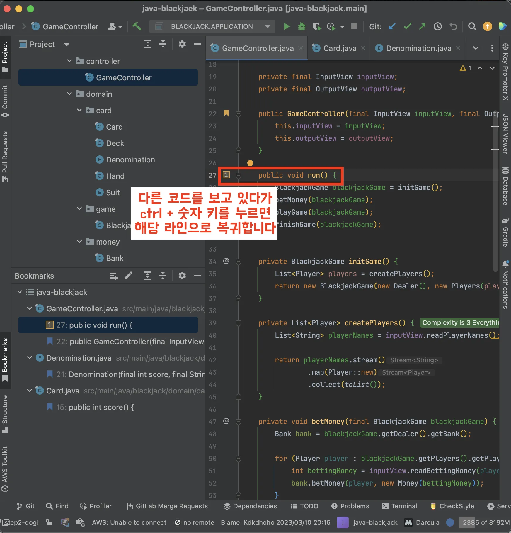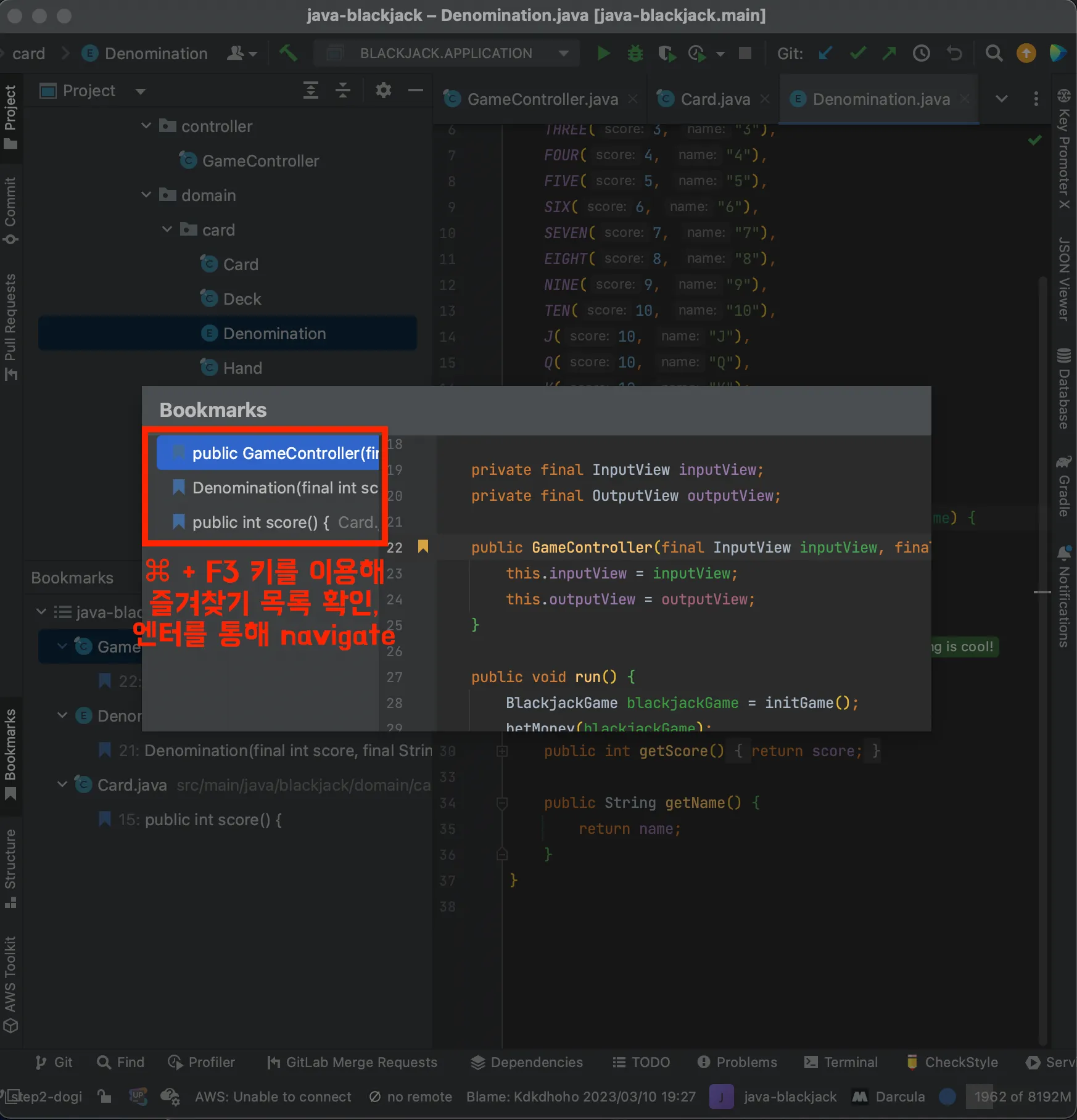 위 방식으로 추가된 북마크는 ⌘2 (윈도우는 alt + 2)를 눌러 Bookmarks 탭을 통해 확인할 수 있고 더블 클릭을 통해 찾아갈 수 있습니다. 또는 ⌘ + F3 (윈도우는 shift + F11)와 엔터를 조합하면 북마크 팝업을 통해 더욱 쉽게 코드를 찾아갈 수 있습니다.