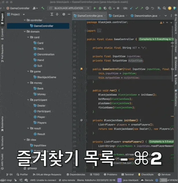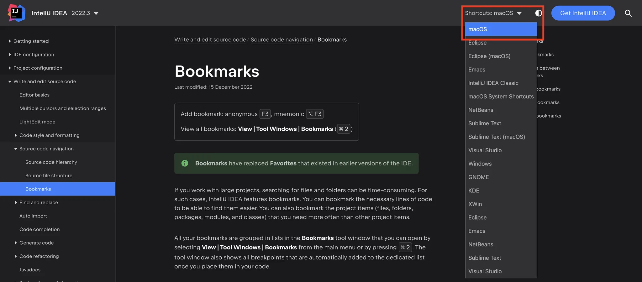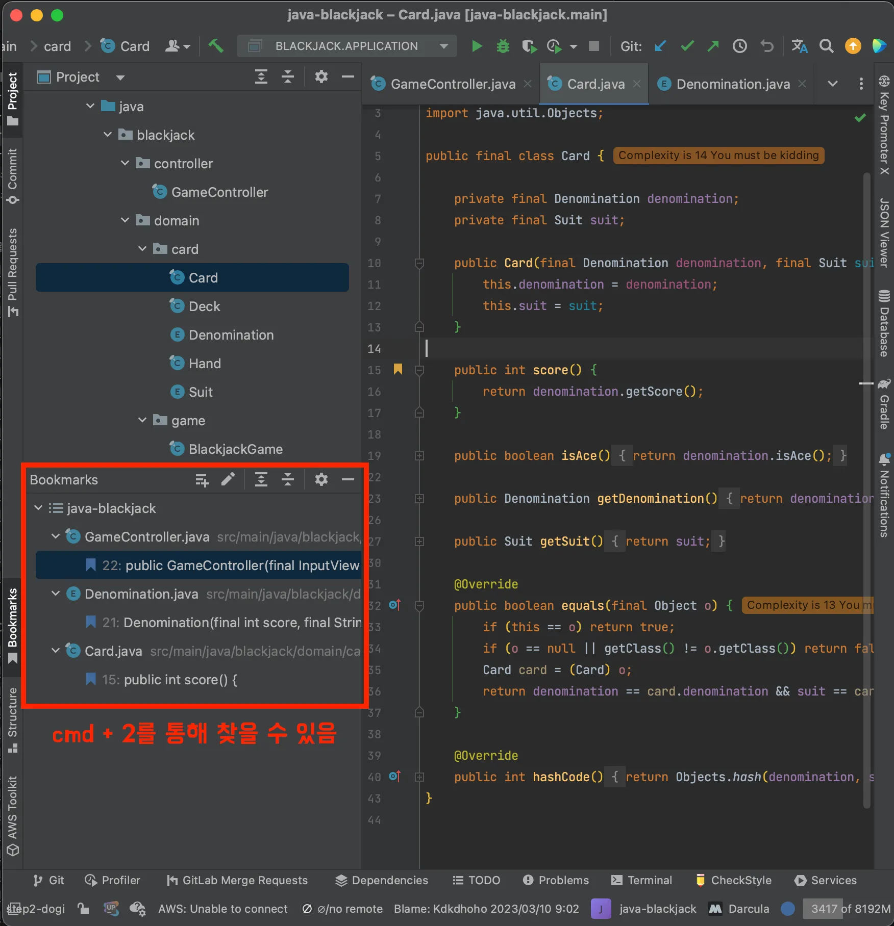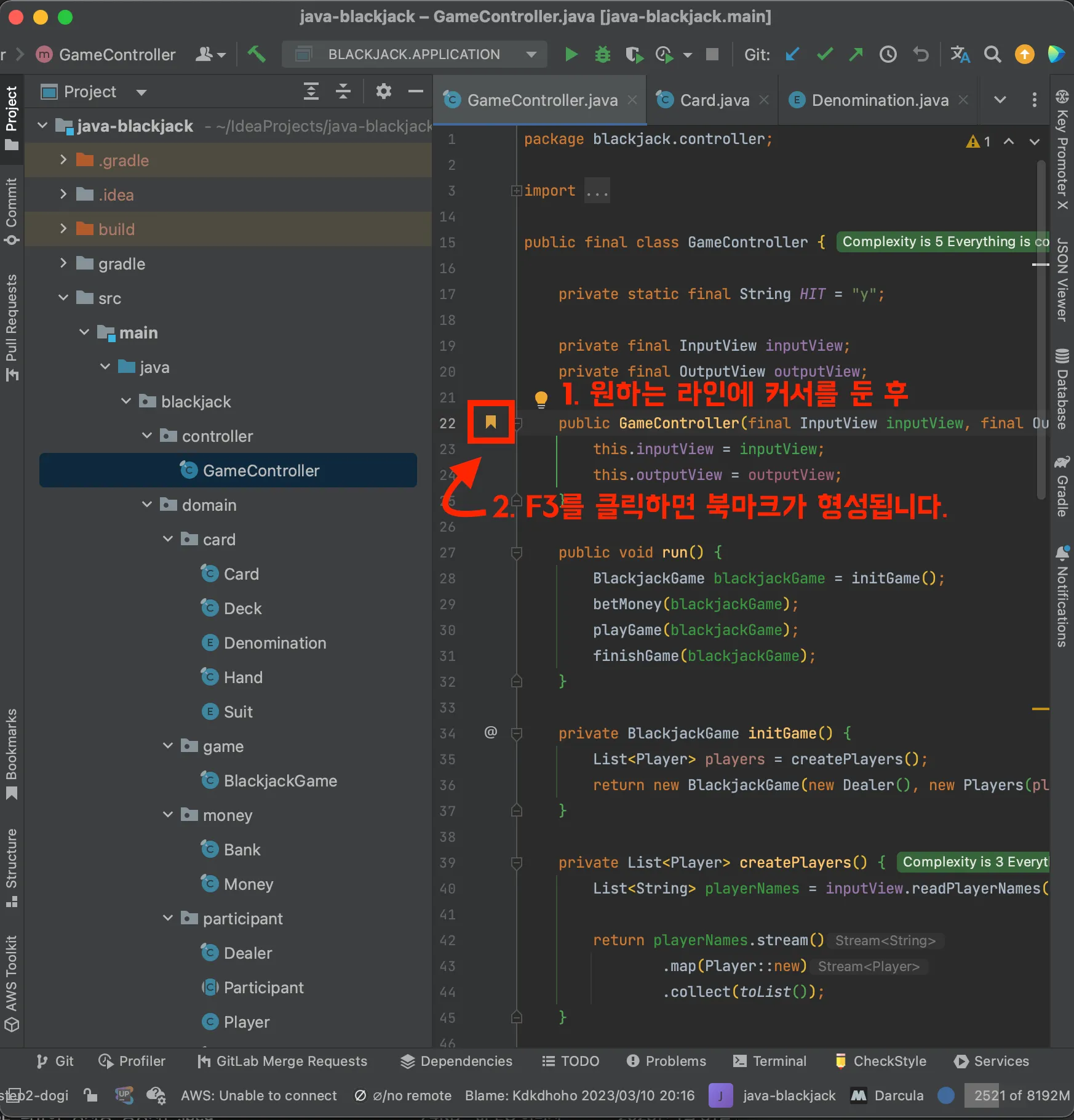 위 방식으로 추가된 북마크는 ⌘2 (윈도우는 alt + 2)를 눌러 Bookmarks 탭을 통해 확인할 수 있고 더블 클릭을 통해 찾아갈 수 있습니다. 또는 ⌘ + F3 (윈도우는 shift + F11)와 엔터를 조합하면 북마크 팝업을 통해 더욱 쉽게 코드를 찾아갈 수 있습니다.