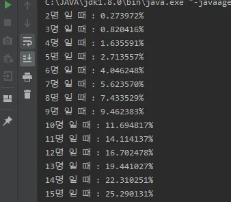 BigDecimal denominator = new BigDecimal(365).pow(i).multiply(factorial(new BigDecimal(365 - i))); // 분모는 365의 n승 x (365-n)!