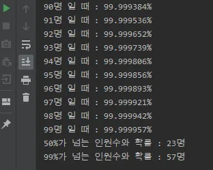 23명이 넘어가면 50%, 57명이 넘어가면 99%가 됩니다.