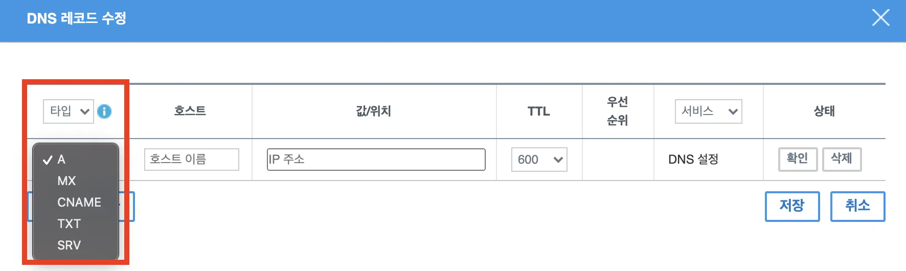 레코드 수정을 들어가보면 다음과 같은 레코드들을 등록할 수 있는 것을 볼 수 있습니다.