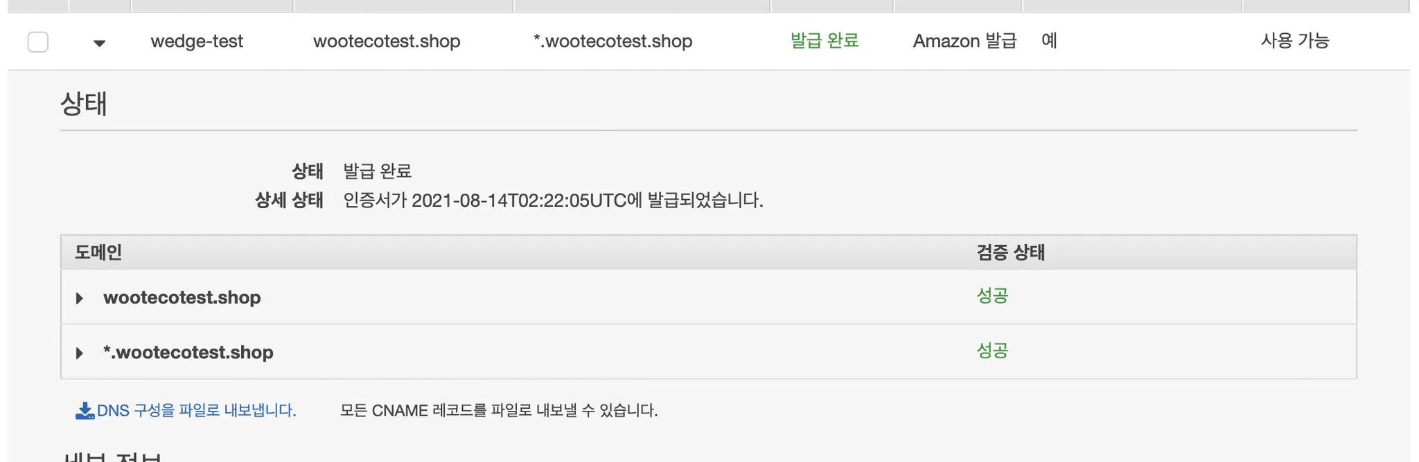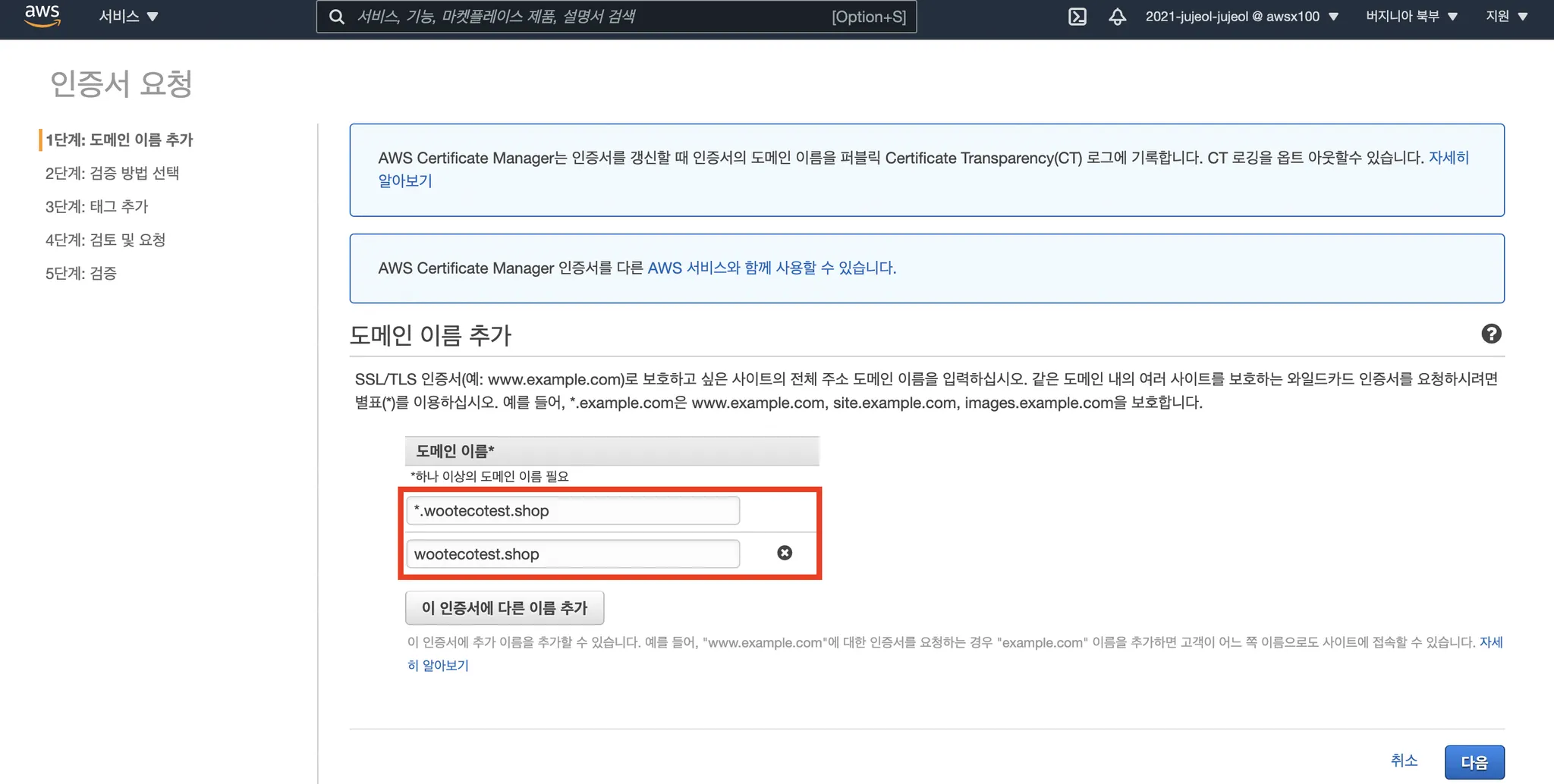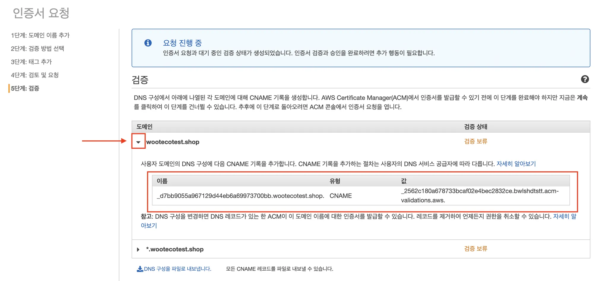 제 목적은 api.wootechtest.shop 에 적용하려는 것이므로 해당 도메인만 인증서를 적용해도 상관없습니다만, 이후 어떻게 확장될 지 몰라 와일드카드로 등록하였습니다.