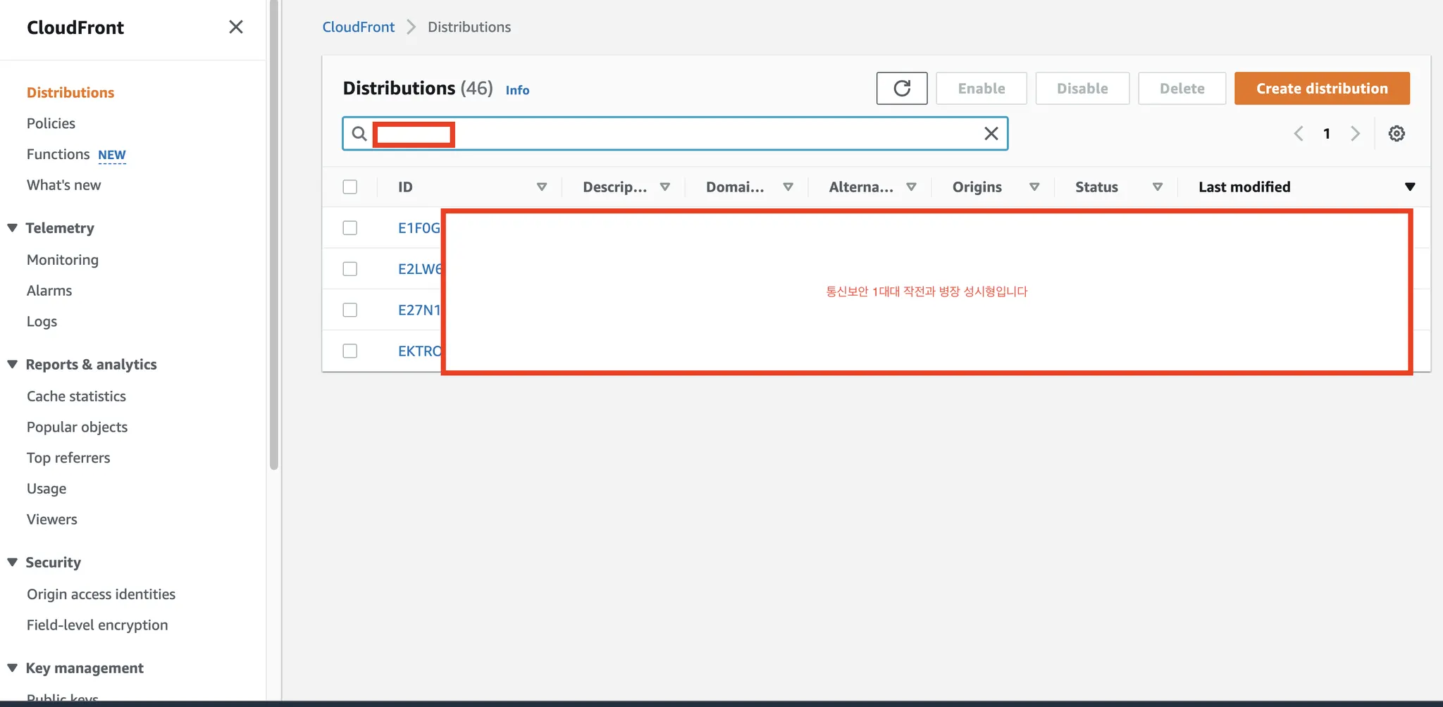 AWS 클라우드 프론트 웹콘솔로 이동하여 프론트 서버를 연동하고 있는 Distribution을 클릭해 봅시다.