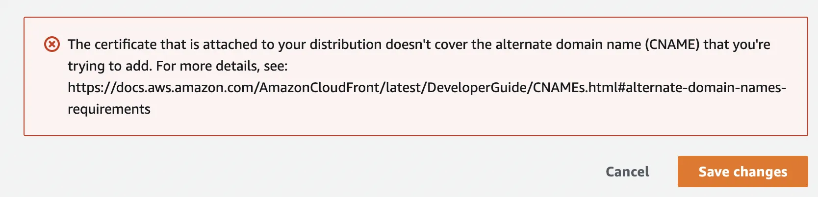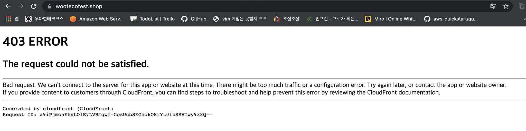 잉ㅠ 403ㅠ 넌 못 지나간다 엔딩인데요, 이는 AWS 클라우드프론트에선 허가되지 않은 CNAME 도메인에서의 접속을 차단하고 있기 때문입니다. 아마존님의 허락을 얻으러 떠나봅시다.