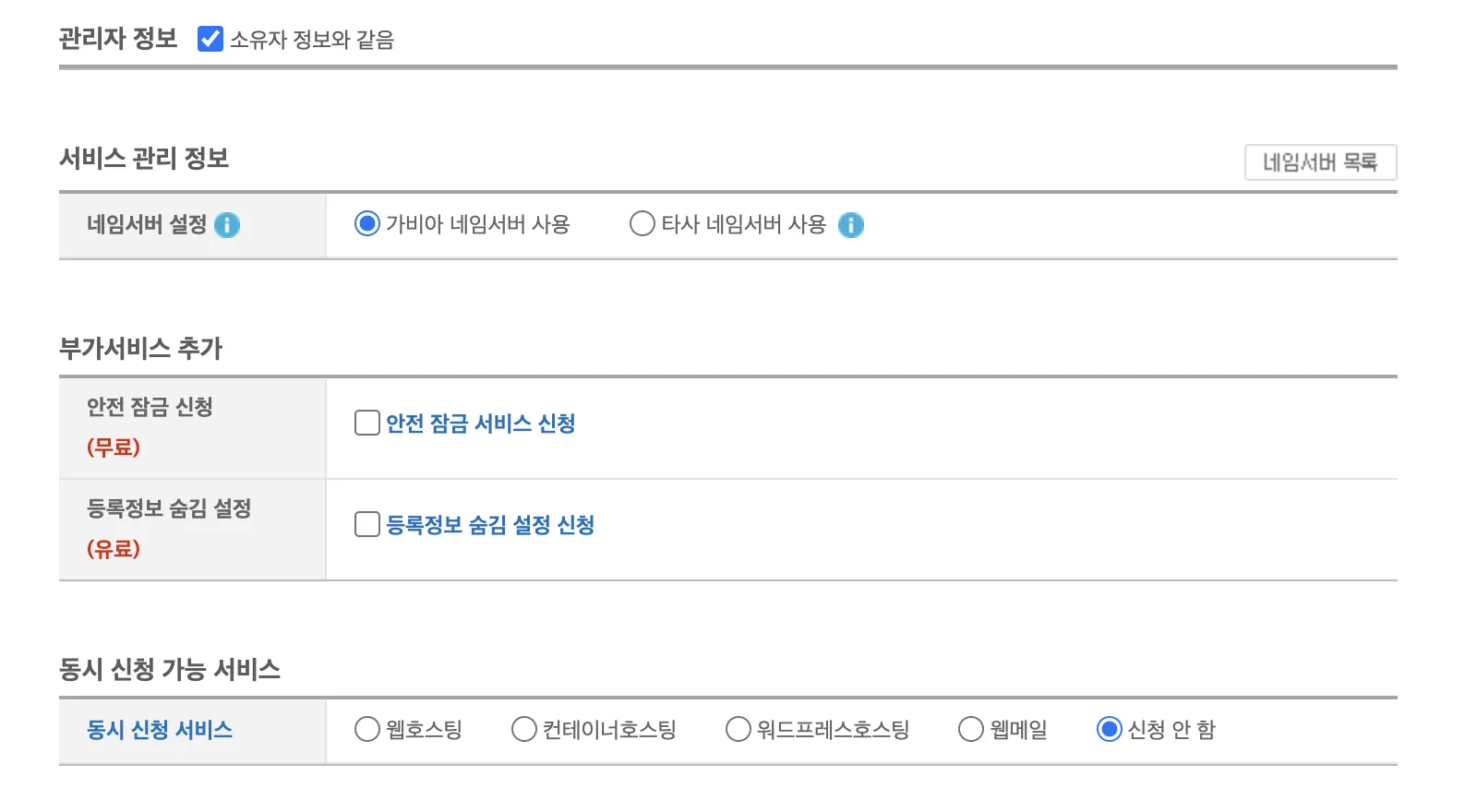 관리자 정보 같은 경우 도메인서버에 등록되는 정보이기 때문에 개인정보가 노출되는 걸 원치 않는다면 소요자 정보와 같음 체크박스를 해제하고 회사 정보로 적어주셔요! 저희팀 같은 경우 제 개인정보로 등록했기 때문에 jujeol-jujeol.com 도메인을 조회해보면 제 집주소 전화번호가 다 나온답니다 ^_^..!