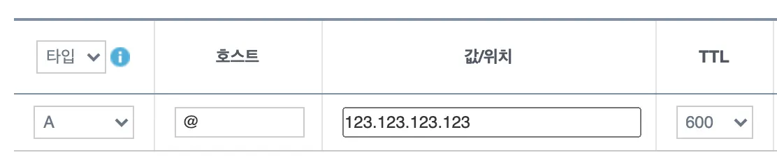 위와 같이 등록하면, http://wootecotest.shop으로 접속했을 때 123.123.123.123 ip로 연결해준다는 의미입니다. {@ 호스트는 가비아에서 루트 도메인(www. 같은 서브도메인이 안 붙은 도메인)을 의미하는 기호입니다. 루트 도메인을 의미하는 기호는 호스팅 업체마다 다릅니다.}