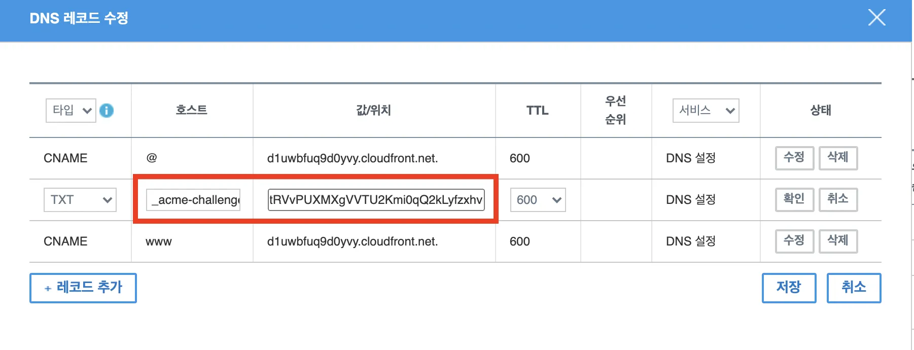 letsencrypt도 도메인 인증을 요구하는데, 가비아에서는 다음과 같이 처리하면 됩니다.