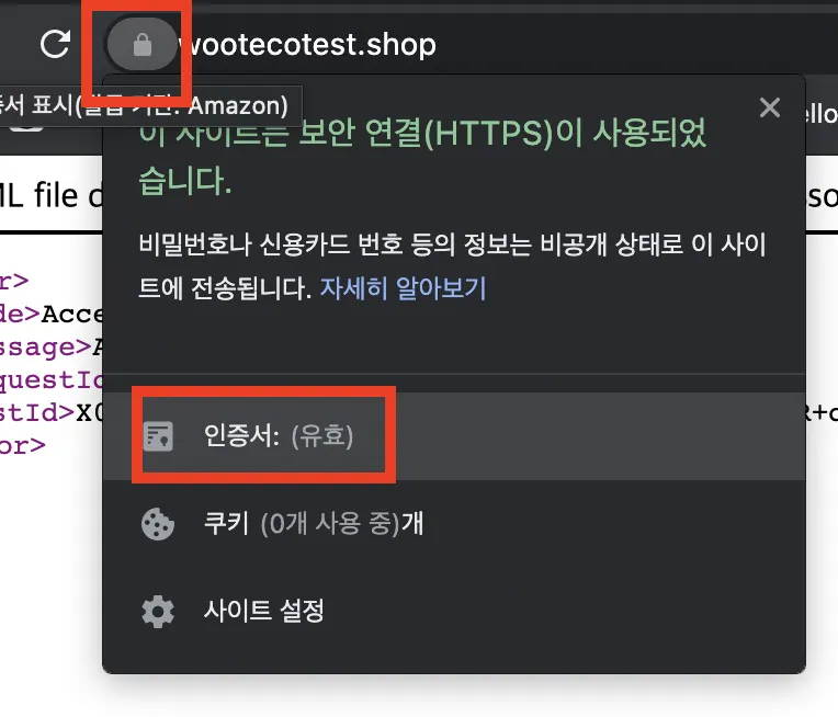 이제 다시 한 번 wootecotest.shop에 접속해보겠습니다. 인증서도 적용했기 때문에, 443포트로 접속해(https 프로토콜) 보겠습니다