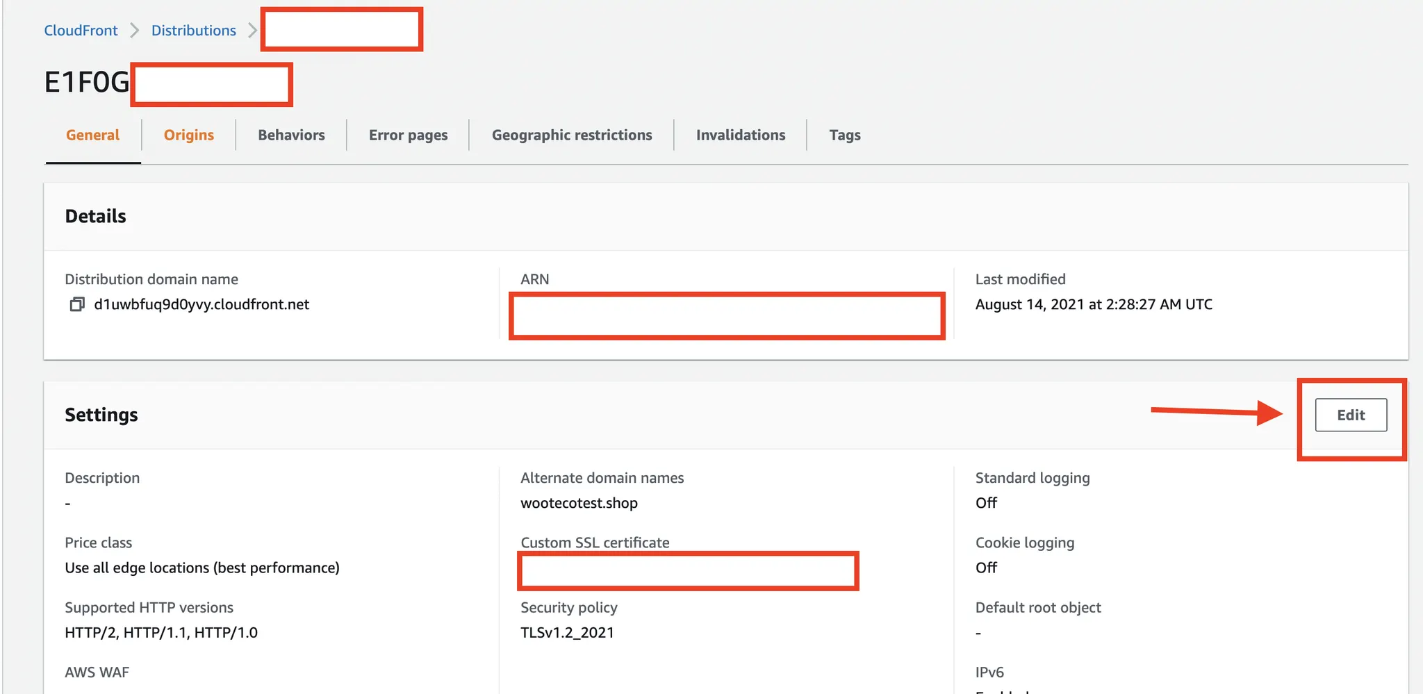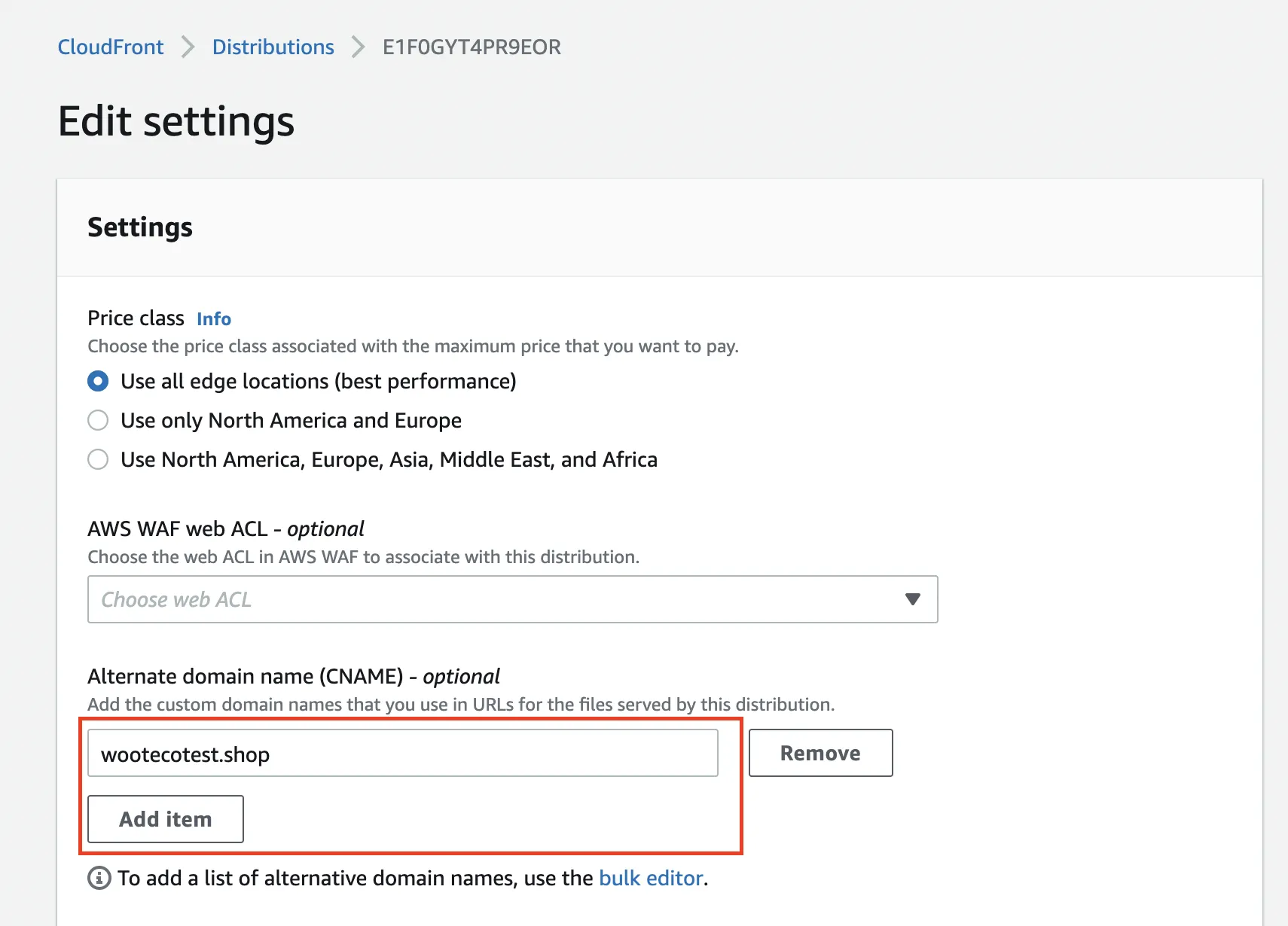 이제 해당 인증서를 사용할 수 있습니다. CloudFront → distrubutuion → edit → CNAME을 등록하는 화면으로 돌아갑시다!