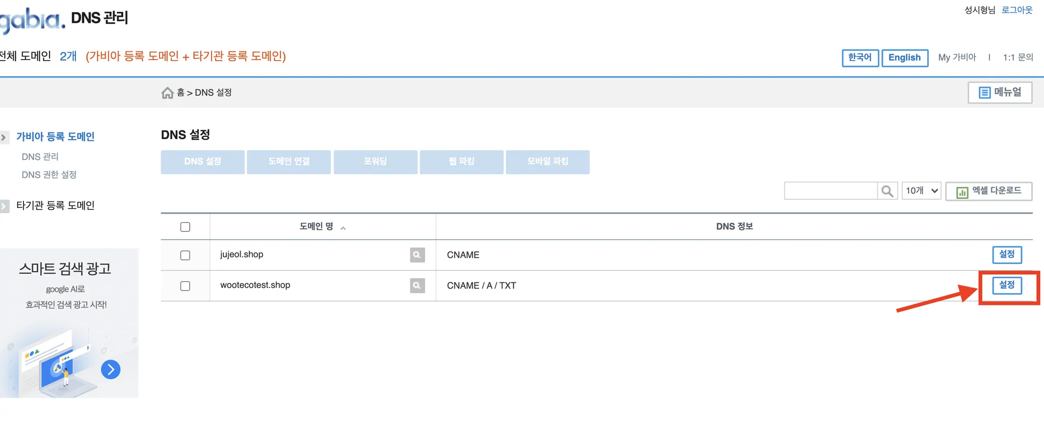 내 도메인 목록을 확인할 수 있고, 필요하다면 설정 버튼을 눌러 도메인 관련 정보를 등록할 수 있습니다.