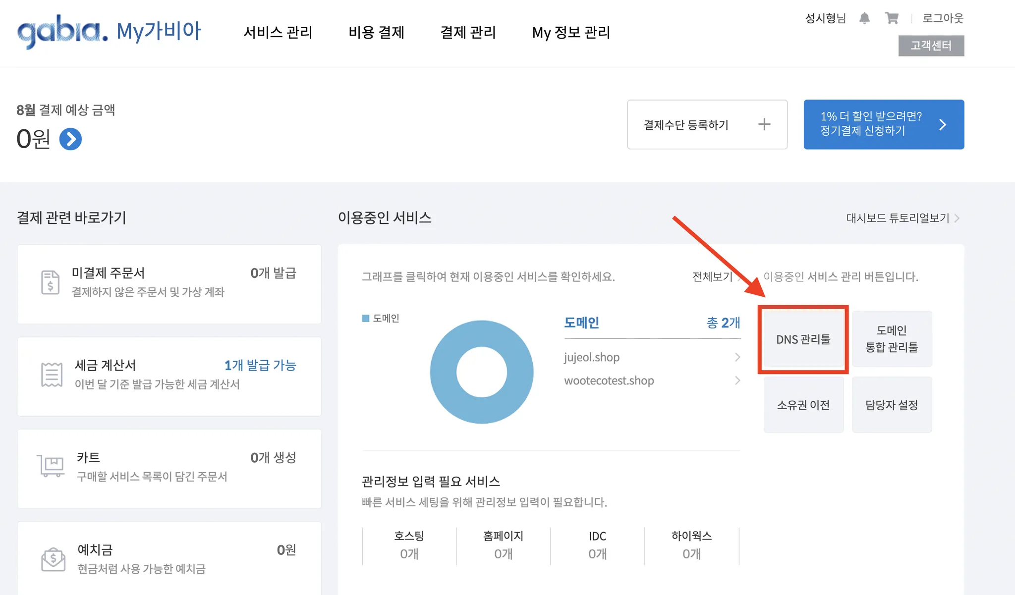 등록이 정상적으로 진행되었다면 도메인이 제공중인 것을 확인할 수 있습니다. DNS 관리툴을 눌러줍니다.