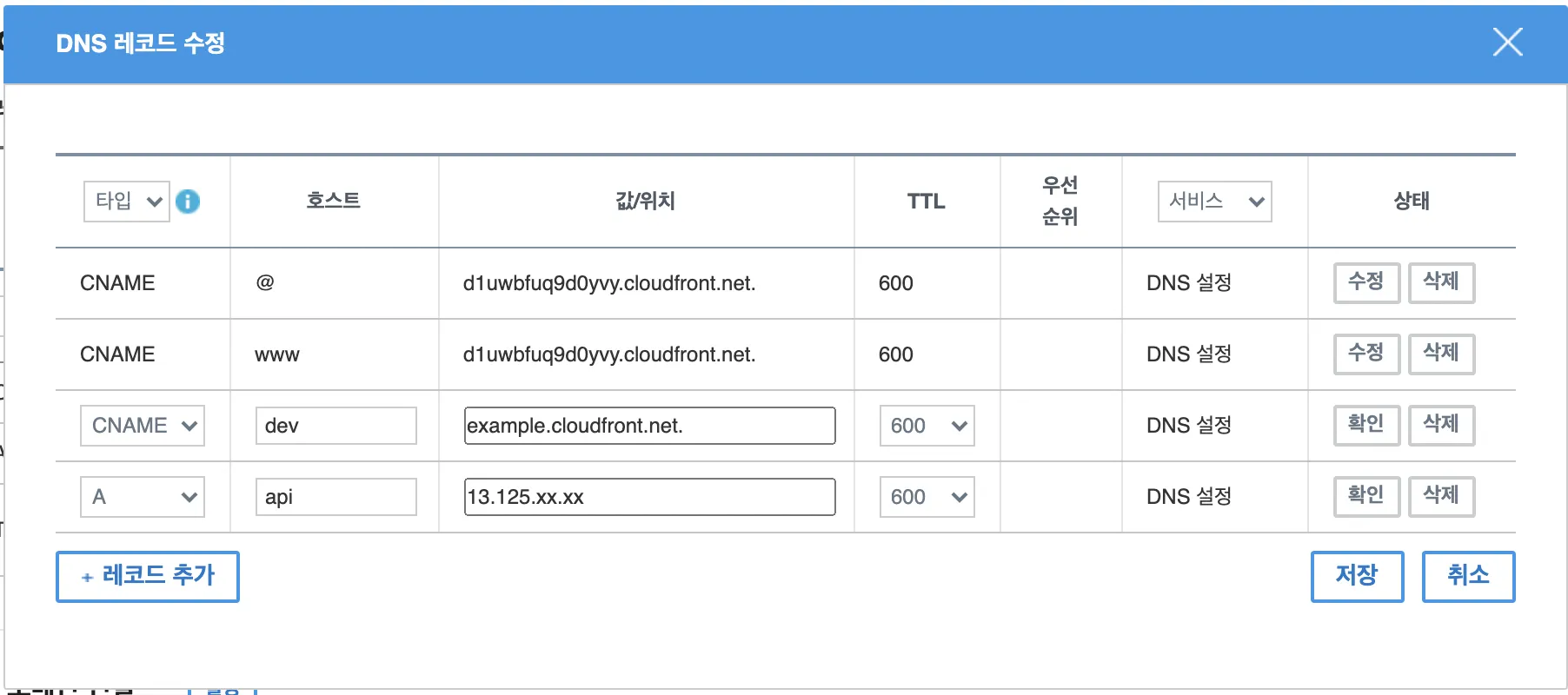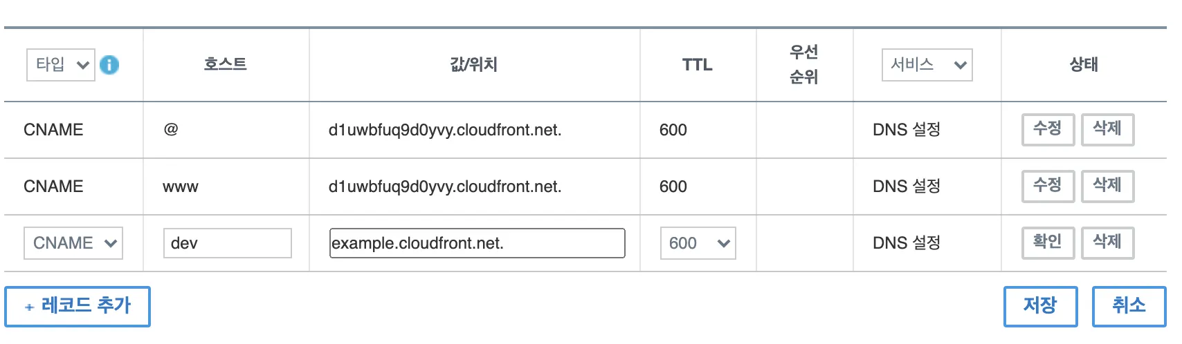 도메인 구매 → CNAME 등록 → CloudFront에 Alternate CNAME 등록 → ACM 공인인증서 등록 → DNS 검증 → CNAME 최종 등록 순서로 CNAME을 등록해보았습니다. dev는 CNAME을 통해 연결해주는 CloudFront Distribution url만 다를 뿐 동일한 과정이므로 생략할께요. 다음처럼 등록하면 되겠죠?