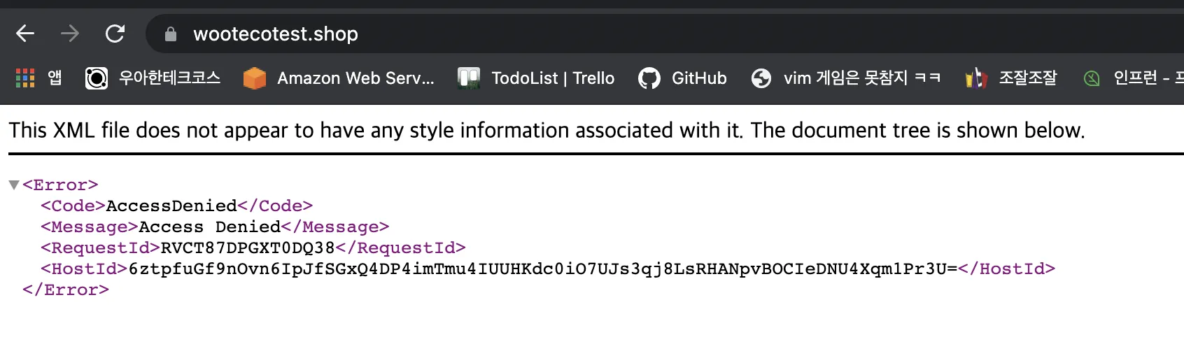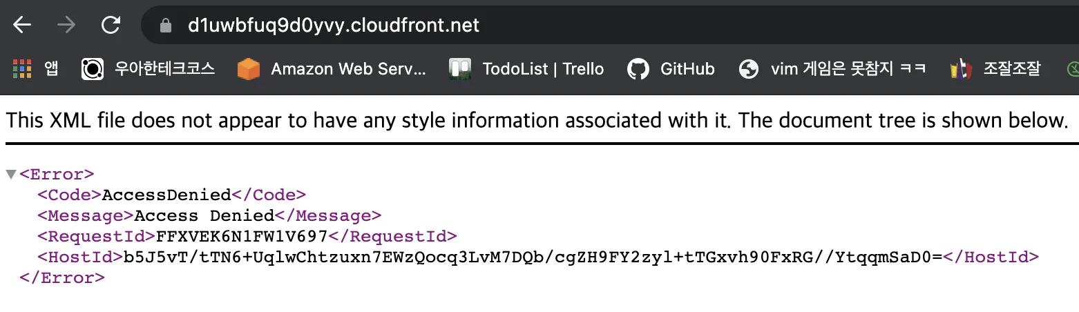 이건 제가 게을러서 예제 S3 버킷에 index.html을 안 올렸기 때문입니다 ㅎ 없는 자원을 요청했을 때 에러페이지 처리도 안 해줬습니다 왜요 뭐요