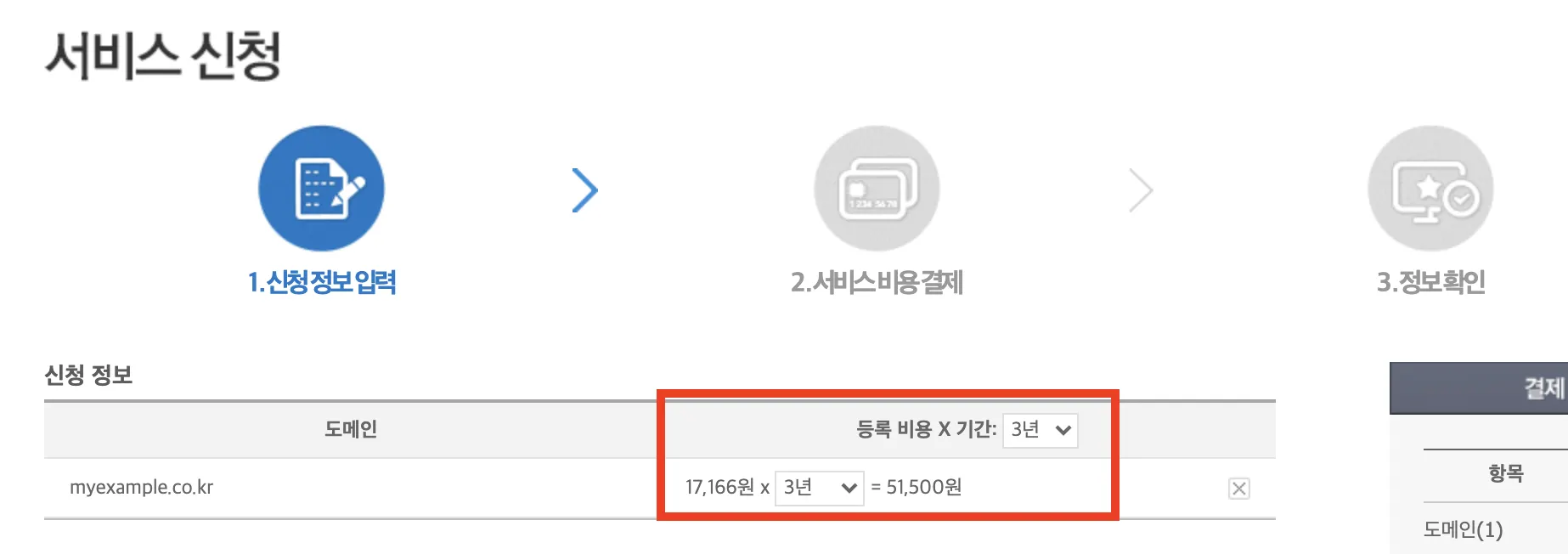 원하는 도메인을 선택하셨다면 결제를 진행하시면 되는데요, 만약 이벤트 가격이 진행중인 상품을 선택하셨다면 등록기간이 3년이 디폴트로 잡혀있는 것만 주의하시면 되겠습니다.