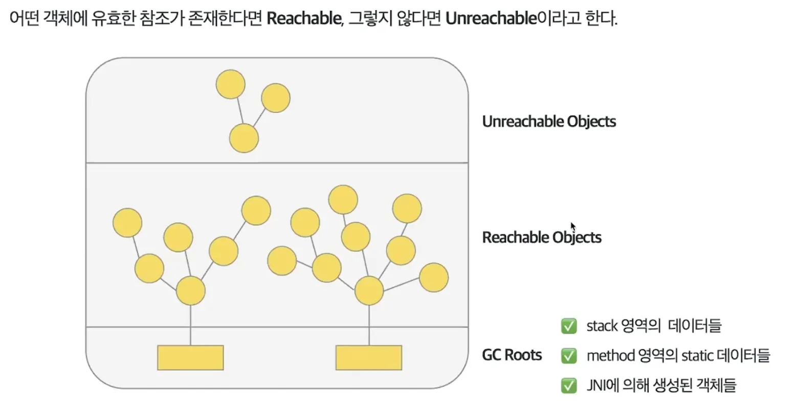 Garbage collector가 Stack의 모든 변수를 스켄하면서 각각 어떤 객체를 참조하고 있는지 찾아서 마킹