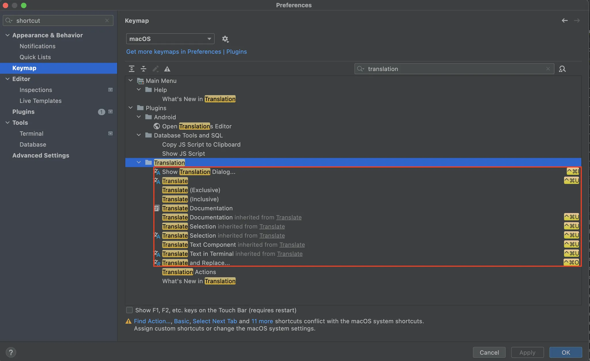 이 포스팅을 적게된 것은 translation의 여러 기능들 때문인데요, keymap에서 translation으로 검색하면 해당하는 단축키를 볼 수 있습니다.