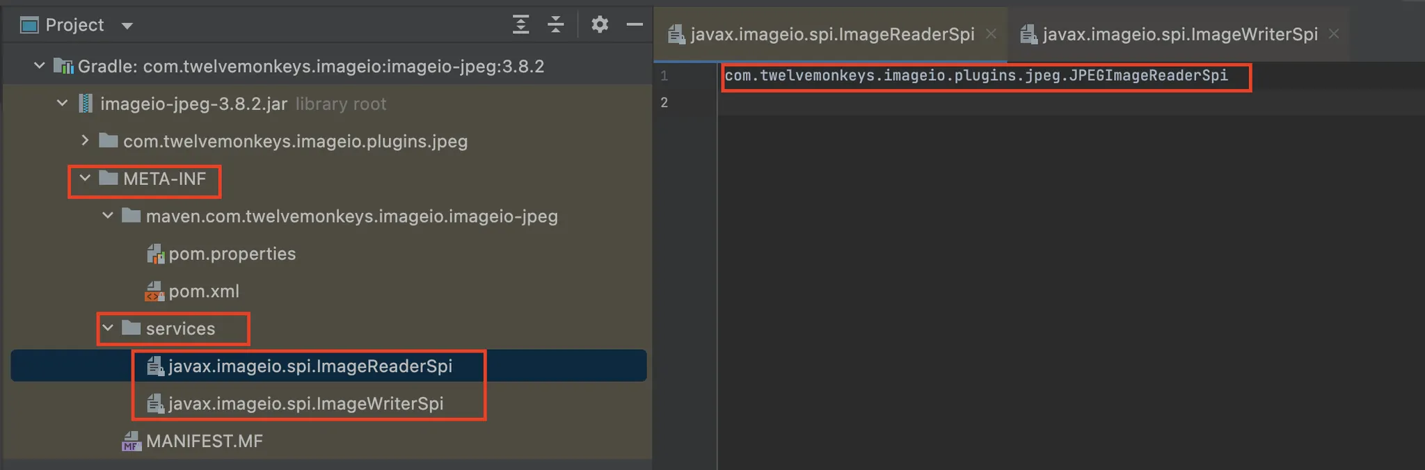 서비스 제공자인 twelvemonkeys의 META-INF 폴더를 확인해보면, ServiceLoader의 제공 형식에 맞게 구현체의 위치를 명시해놓았습니다.