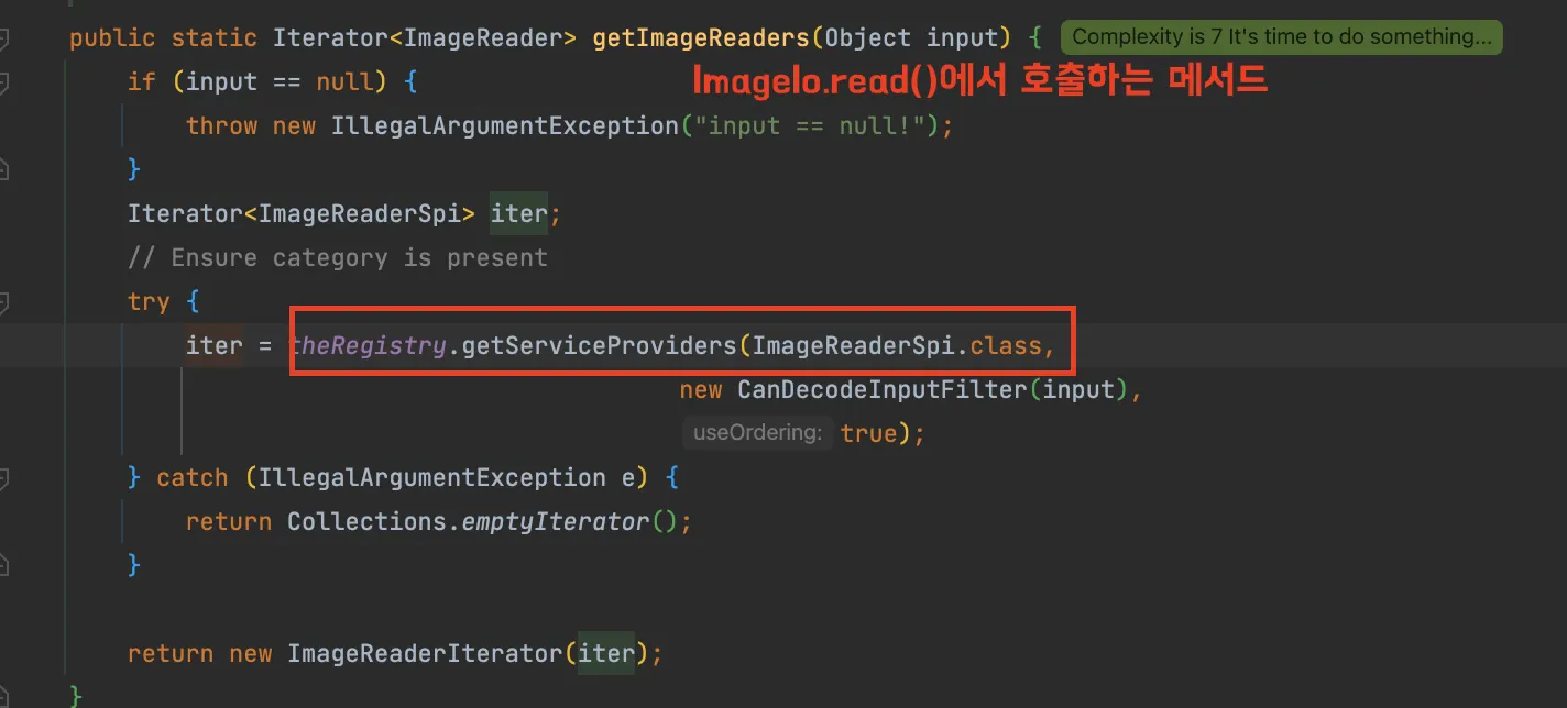 서비스 제공자 프레임워크인 ImageIO에선 해당 구현체를 이용해 read하고 있습니다. ImageIO.read() 코드 하위의 getImageReaders()의 코드 중 일부입니다.
